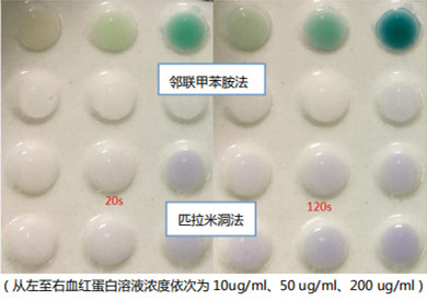 加入試劑后初呈淺綠色,逐漸呈明顯藍(lán)褐色